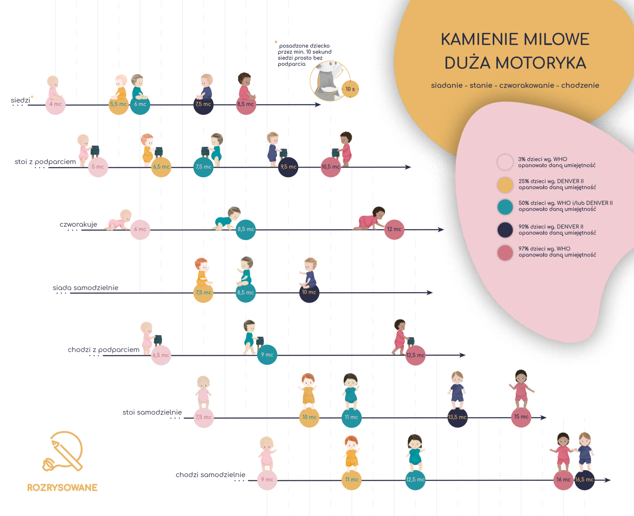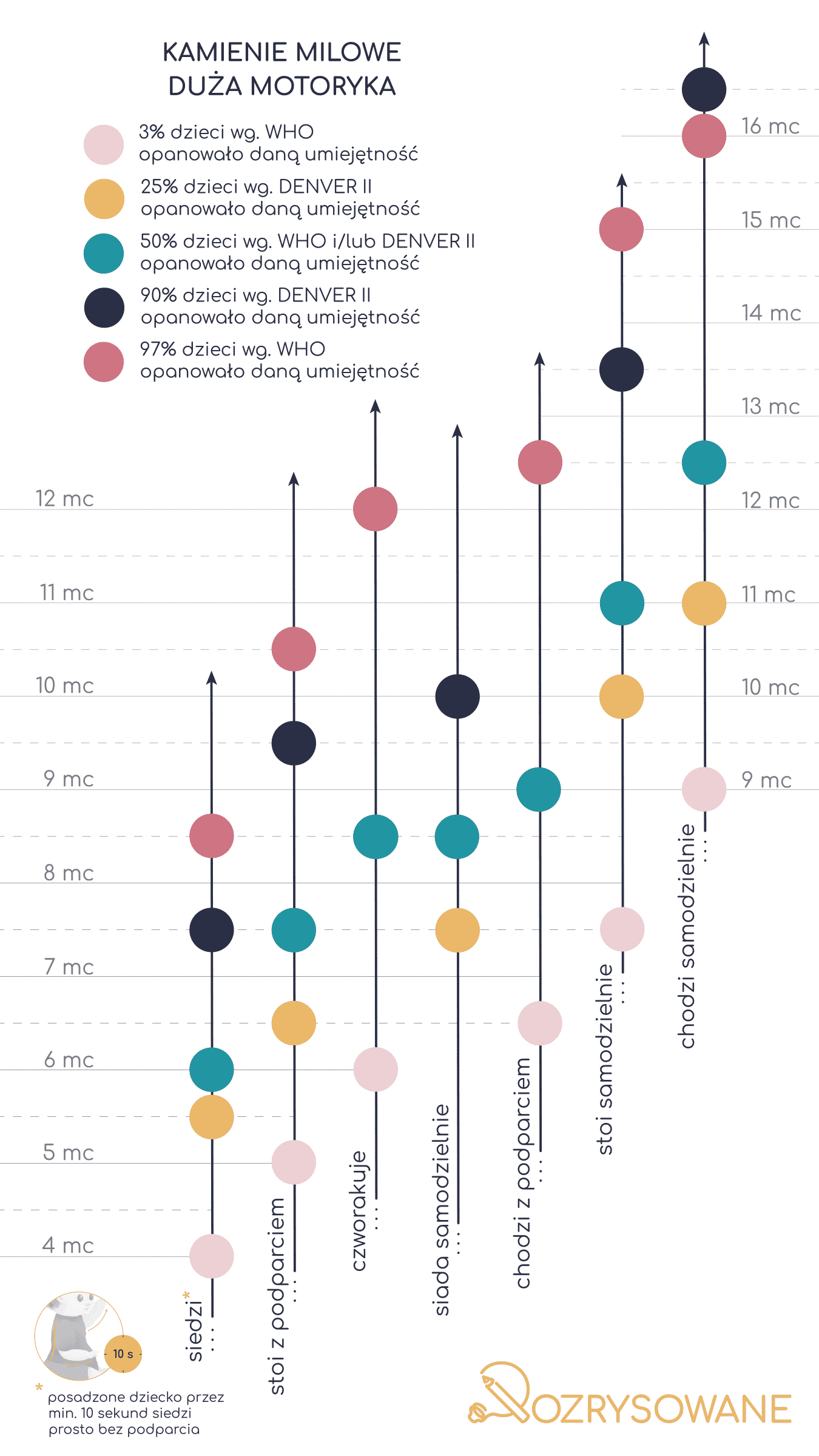 Notatka przedstawia jaki odsetek (%) dzieci opanowuje daną umiejętność w danym wieku według norm WHO i/lub skali DENVER II. Przykład: Według WHO 97% dzieci nabędzie umiejętność stania z podparciem (np. trzymając się krzesła) do wieku 10,5 miesięcy.